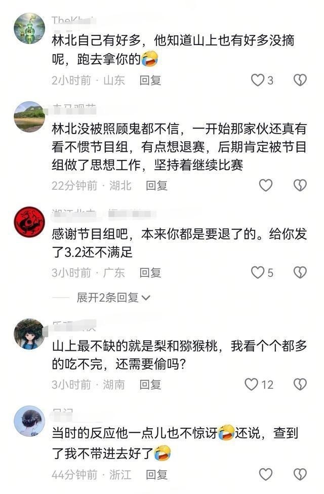 这番话一说,直播间里顿时热闹起来,有的人开始觉得他可怜,是不是真有什么内幕。可没等大家反应过来,老中医又抛出了一个更猛的料。他话锋一转,直接把枪口对准了这次比赛的另一个热门选手,林北。他说林北这个人手脚不干净,经常跑到他的营地里偷他辛辛苦苦采来的猕猴桃和梨吃。为了证明自己没说谎,他甚至把当时在场拍摄的一个工作人员的名字都给爆了出来,说那人可以作证。