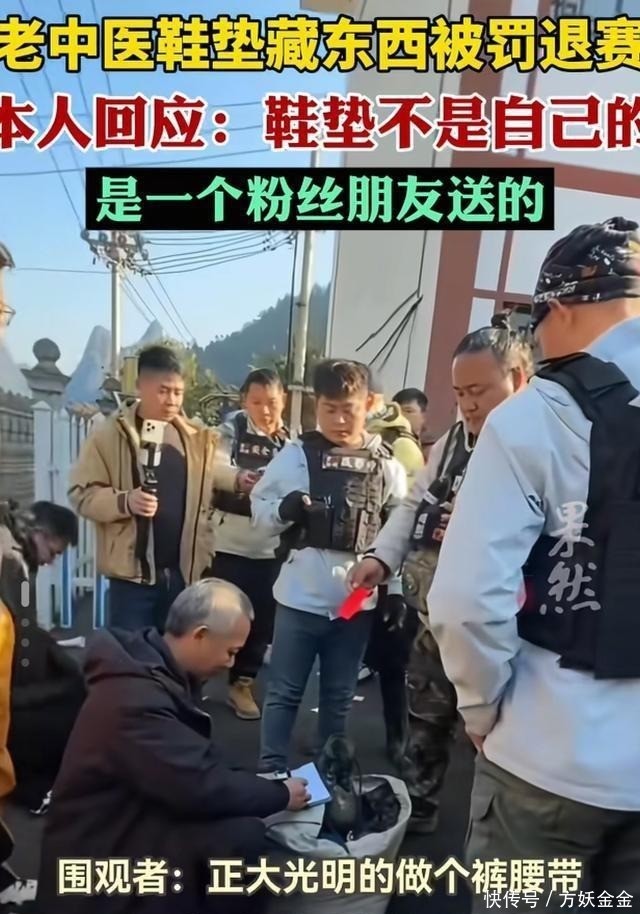 这事儿一出,网上立马就炸了锅。这究竟是怎么一回事呢?原来,在所有选手做最后准备,往肚子里塞东西补充能量的时候,裁判组正进行着最严格的赛前检查。从头到脚,从衣服领子到裤腿,任何一个可能藏东西的地方都不放过。查到这位老中医大哥时,裁判捏了捏他的鞋垫,感觉手感不对,特别厚实,还有点硬。